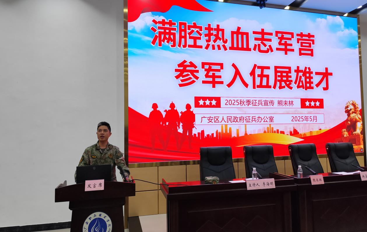 熊未林代表广安区人民政府征兵办公室,围绕大学生入伍优惠政策、发展前景与退役保障、应征入伍条件、应征入伍流程、军营生活、谨防征兵诈骗和算好参军五笔账七个方面内容,给同学们作了一场深入人心的国防教育和参军入伍政策宣讲。
