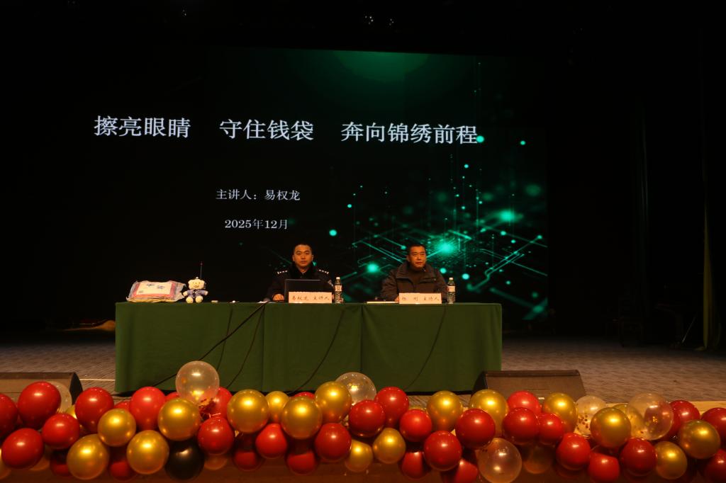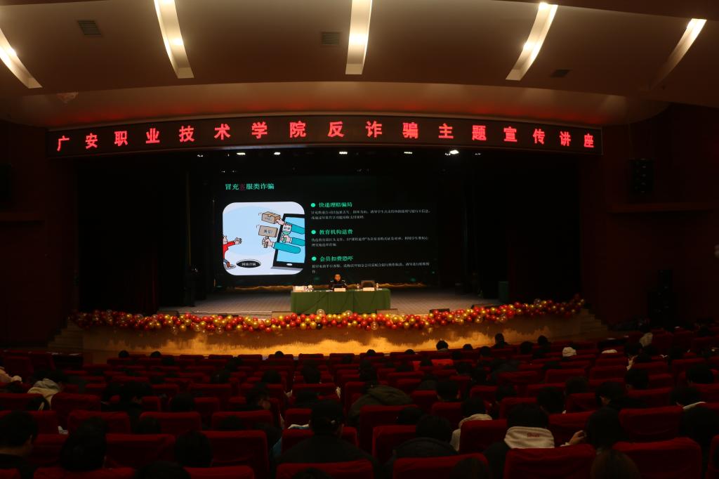 2025年12月23日,学校保卫处联合广安区反诈中心在学校杏坛举行反诈防骗专题讲座。讲座由广安区公安分局一级警长易权龙警官主讲,全校800余学生听取了讲座。