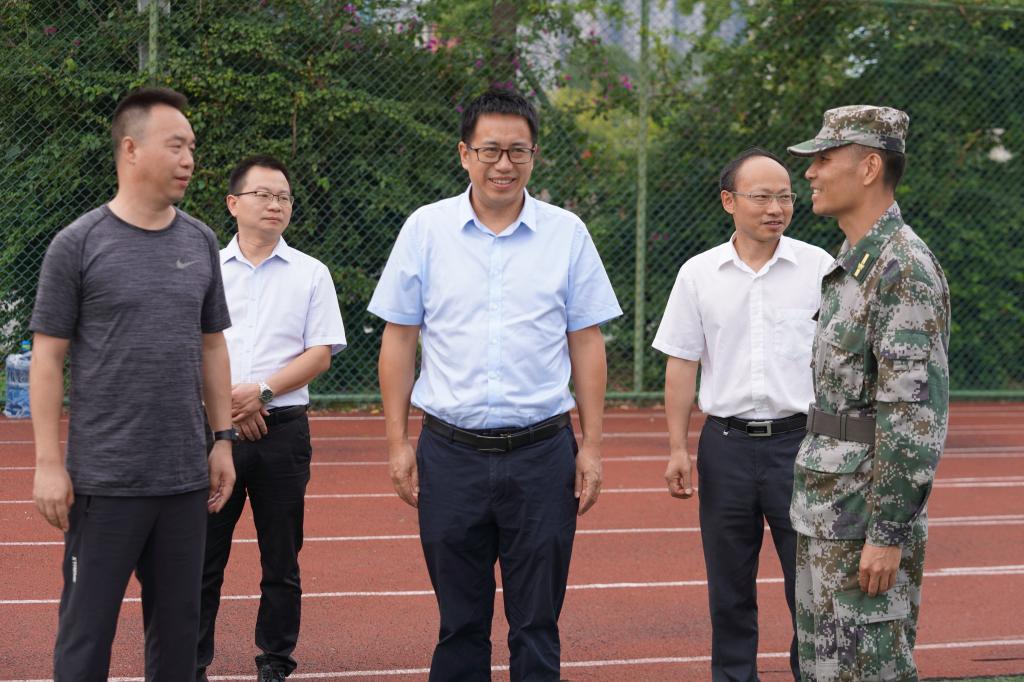 训练场上,同学们口号响亮,志气昂扬,迈着整齐的步伐。王义全一行详细了解了军训工作的开展情况,与承训教官、参训同学进行了亲切的交流,并代表学校向全体教官、指导员致以诚挚的问候,对同学们展示出的高昂的士气、饱满的精神、严明的纪律予以赞许。