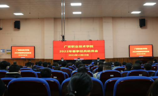12月23日下午,学校在紫金厅举行2022年大学生征兵动员会。广安区委常委、区人武部上校政委朱斌,广安军分区动员处参谋张志鸿到校宣传动员,二级学院征兵负责人、有意向应征入伍学生代表共220人参加会议,动员会由学校武装部部长黄宏芮主持。