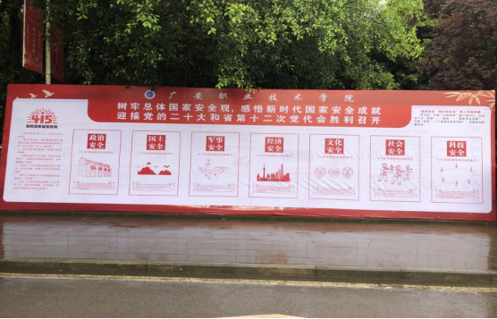 按照省市要求,结合学校实际,4月初向全校师生推送了“广安职业技术学院关于开展2022年全民国家安全教育日暨‘国家安全宣传教育月’活动方案”,安排部署了国家安全宣传教育相关工作,各单位积极响应。二级学院组织师生开展线上讨论交流,各班级以“树牢总体国家安全观,感悟新时代国家安全成就,迎接党的二十大和省第十二次党代会胜利召开”为主题,结合政治安全、国土安全、军事安全等16个内容开展了班团活动;师生员工在“川观新闻”APP平台上开展了“国家安全·我们的安全”有奖答题活动,进一步了解了总体国家安全观,全面普及宣传了国家安全教育知识;活动期间,保卫处搭建了国家安全宣传点,通过设置桁架、展板、橱窗、悬挂横幅等方式进行定点宣传;宣传部通过微信公众号、校园网站、电子显示屏等形式开展了国家安全知识推送,营造了全民共筑国家安全良好氛围。
