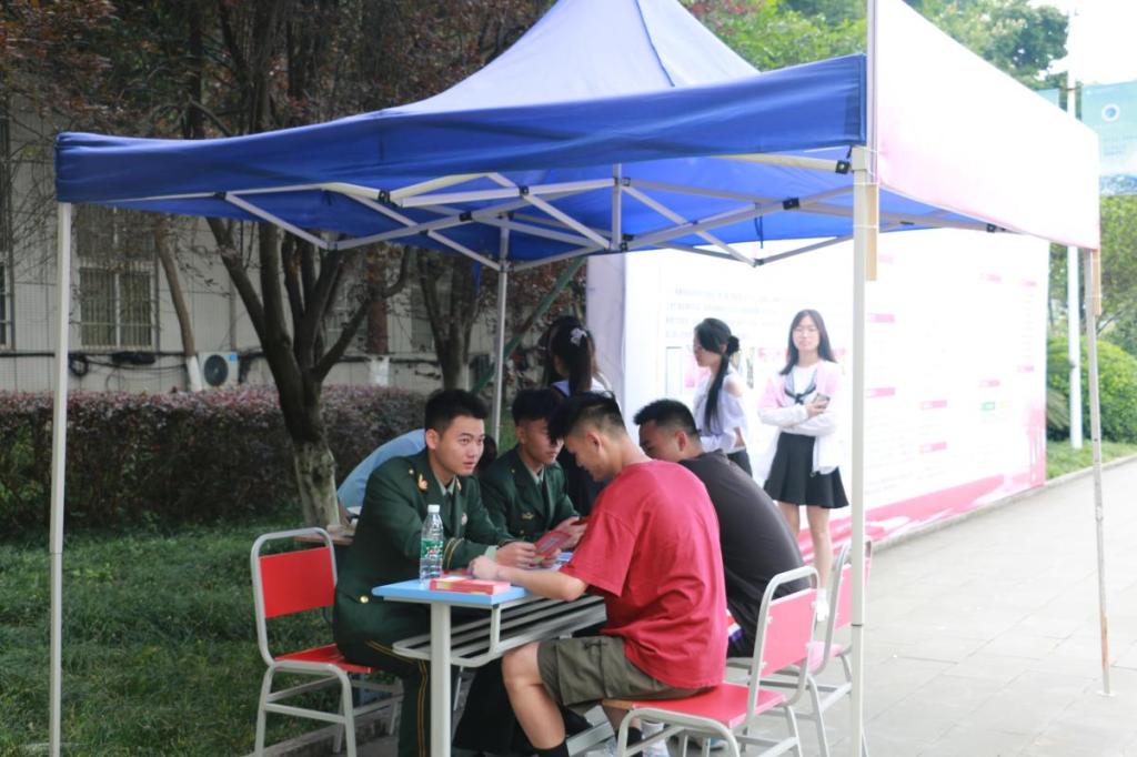 “报名参军体检有哪些要求?”“去部队有哪些发展途径?”“我们大学生有哪些优待政策”……学校征兵宣传点现场,吸引了众多青年学子前来咨询。同学们热情高涨,纷纷围绕着武装部老师、国防先锋社同学,争先恐后的提出自己关切的问题;武装部通过向各二级学院推送通知,悬挂征兵宣传横幅、设置征兵宣传展板桁架、发放征兵宣传手册、播放征兵宣传录像、召开征兵动员会宣讲等方式向同学们宣传解读2023年征兵政策,现场为学生答疑解惑;国防先锋社同学们能主动请缨担任征兵宣传员,通过在征兵宣传点轮流值守、深入教室宣传等方式协助武装部搞好征兵宣传。
