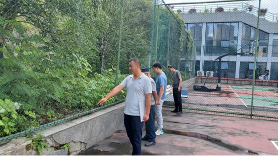 保卫处副处长杨刚带领工作人员仔细排查,重点排查排水系统、地下停车场、紫金花园、篮球场、停车楼道闸处山体等处,查找安全隐患。